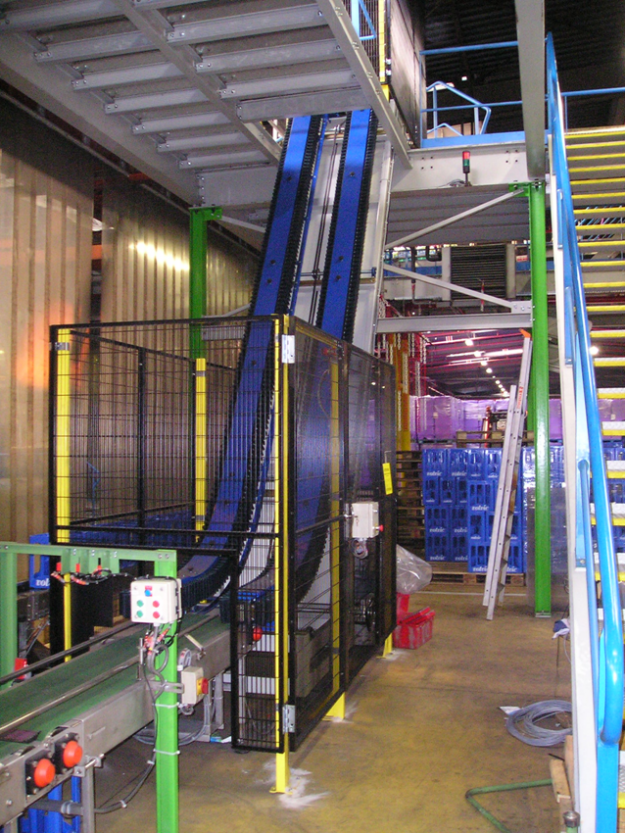 Elévateur-descendeur pour cartons ou caisses. Elever et/ou descendre vos produits en continu à cadence élevée pour libérer un espace produits transportés.